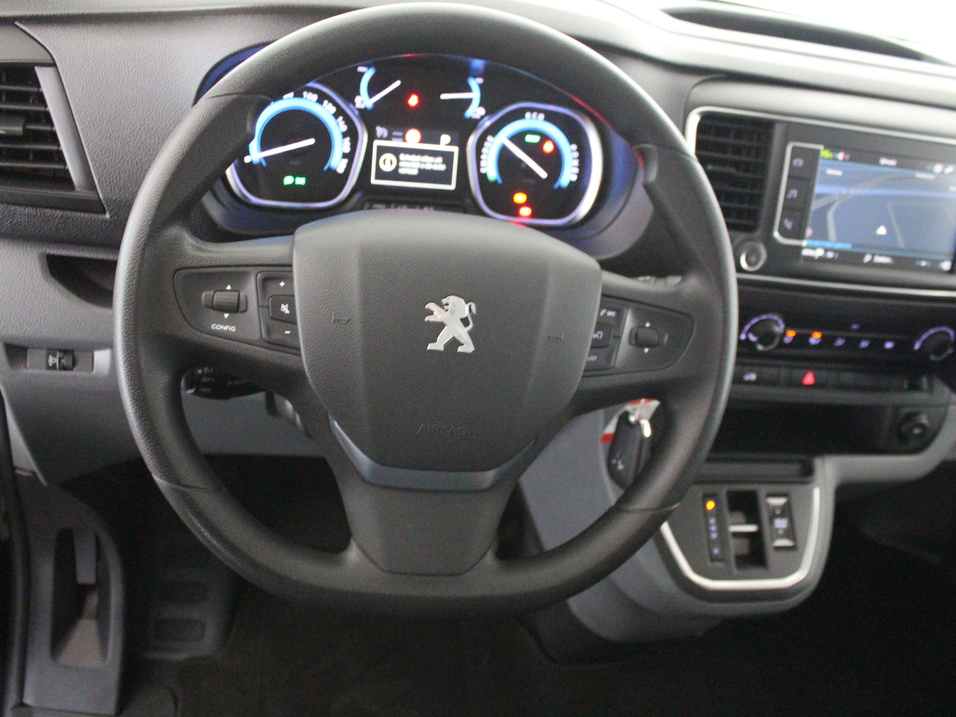 Zoals u mag verwachten van deze Peugeot e-Expert is hij uitgerust met een reeks aan actieve veiligheidssystemen. In het instrumentarium laat de verkeersborddetectie de actuele verkeersborden zien. Het Lane-keeping systeem registreert permanent of u binnen de lijnen van de rijstrook blijft; dwaalt u onbedoeld af, dan waarschuwt het systeem en corrigeert de koers. De sensor van het forward collision warning-systeem registreert permanent de afstand tot voorliggers en grijpt in als een botsing dreigt. Verder is deze auto uitgerust met hill hold functie, brake assist, vermoeidheidsherkenning en bandenspanningcontrolesysteem.